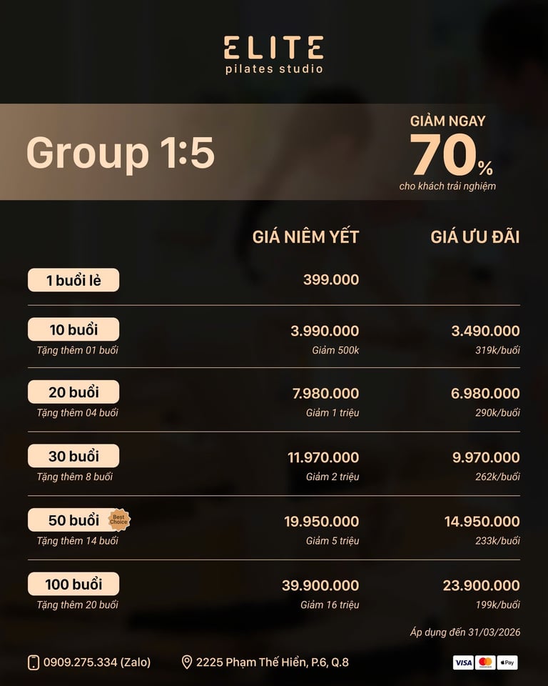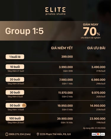 Gói Group 1:5 kết hợp hoàn hảo giữa năng lượng của nhóm và sự điều chỉnh chi tiết trong lớp nhỏ. Elite Pilates giúp bạn dễ dàng lựa chọn gói tập phù hợp để duy trì thói quen, tạo động lực và đạt kết quả lâu dài.